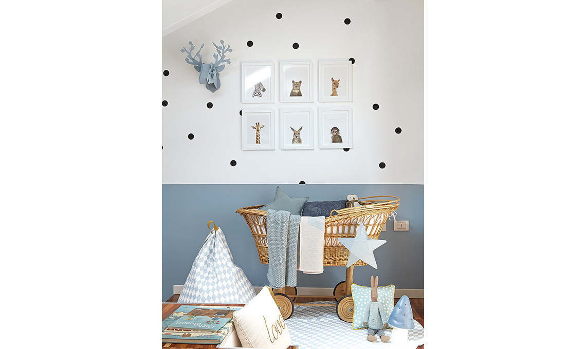 La parete ha la boiserie realizzata con smalto azzurro Alpha Rezisto Mat [Sikkens, codice colore R6.14.65], adesivi a pois neri [MT Masking Tape]. trofeo testa di cervo ridipinto nello stesso colore della parete [MIHO Unexpected Things], fotografie di animali [The Animal Print Shop], poltrona-sacco, tessile letto, cuscini, stella, pupazzi, lampada fungo e tappeto a scacchi bianchi e azzurri da [Le Civette sul Comò] fanno da cornice perfetta alla culla in vimini che usava Filippo da neonato.