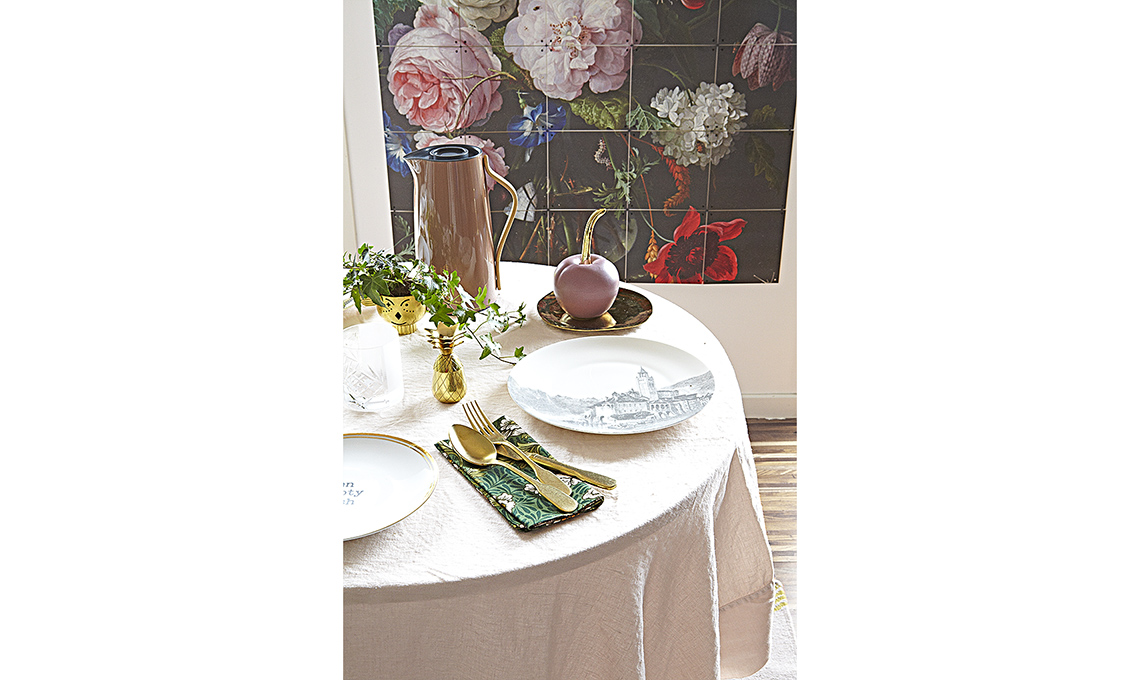 [Bloomingville], barattolo a strisce [Serax], scatola rosa [laRinascente] come il vassoio in paglia di Vienna, sale e pepe, ananas oro e tazzine rosa [Funky Table], bicchieri [Paola C], bottiglia e macinino da caffè [Stelton].