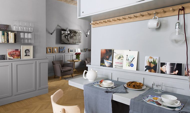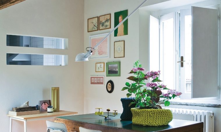 Un disimpegno largo solo 2 m ora è area pranzo: anche uno spazio minimo può diventare ‘abitabile’. Il tavolo Gualtiero fa bistrot [Miniforms, da €1.476]; la lampada ’mini’ è Tassel [Rothschild&Bickers].