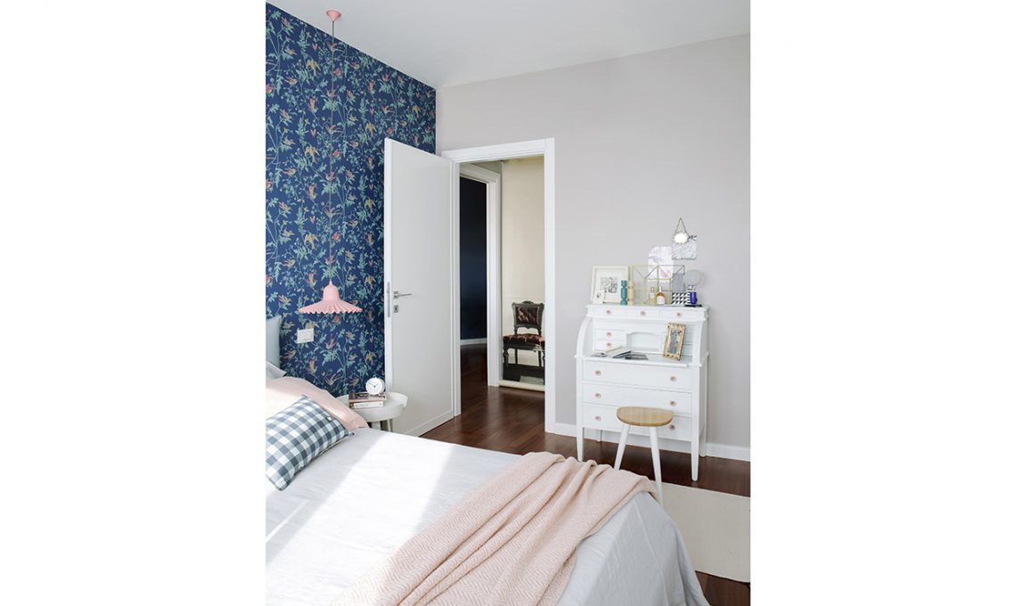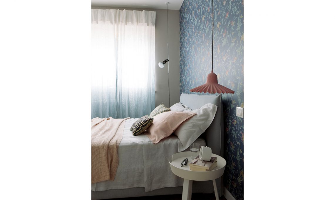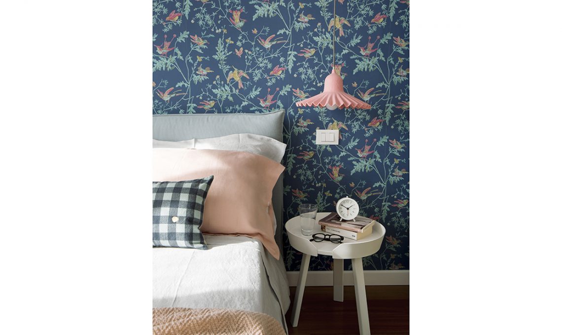 Il blu arriva fin qui e si sposa con dei punti di rosa: letto Lucrezia [Chaarme], tavolino Around [Muuto €349], sveglia [Diamantini e Domeniconi], carta da parati Hummingbirds [Cole & Son].