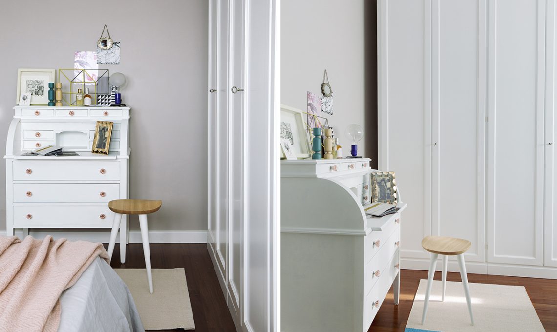 Il secrétaire è un fai-da-te: Iliana l’ha dipinto di bianco e ha inserito dei pomelli in vetro. Sculture in ferro di Antonino Sciortino da [Mia Home Design Gallery]. Sul letto, parure in lino [Chez Moi €120] e plaid [Zara Home].