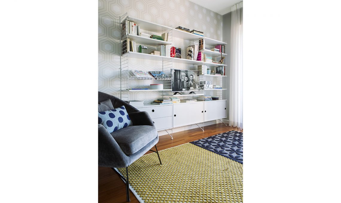 Tappezzeria Hicks Grand [Cole&Son]. Poltroncina Chillout [Saba Italia, da €2.900], libreria [String]. Scimmietta [Kay Bojesen], calendario Timor [Danese €115] e scatole assortite, tutto in vendita da [Dispensabile].
