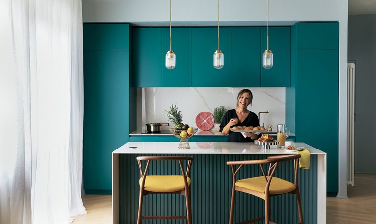 Lo smalto blu cobalto ha vestito come seta la quinta della zona pranzo, per poi scivolare, con discreto garbo e in una tonalità più chiara, in cucina. Questo trucchetto ha permesso di legare a ‘stretto giro’ i due ambienti e di massimizzare il concetto di continuità, cercato anche nei dettagli: il pavimento esagonale richiama la tappezzeria Seventies, le plafoniere si ripetono nel living e nella camera da letto.