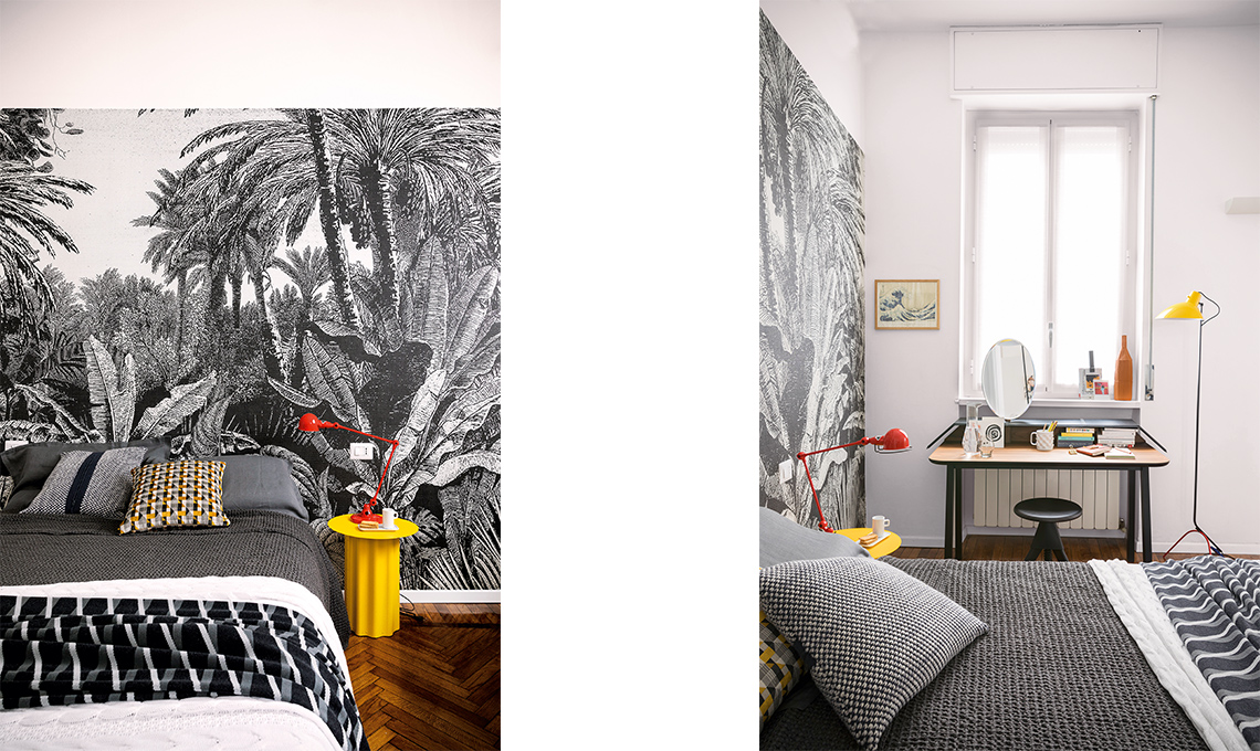 La carta dietro il letto è Tropical Mornings [LondonArt €73/mq]. Sul letto Nordli [Ikea €289] lenzuola e copriletto [Fazzini], plaid bianco [Ikea] e optical [Roberta Licini] ome il cuscino bianco e nero; il giallo è di [Kirkby Design]. Sul tavolino [Diamantini & Domeniconi], lampada vintage [Noleggiocose] e tazzina [Arzberg].