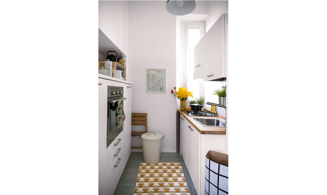 Per dare un tocco di stile, il vecchio top è stato cambiato e ora è in massello [Ikea]; sacco in carta Grid [That Way], passatoia [Pappelina], oggetti e piatti [Casa Croff], strofinaccio Morris [Milou Milano], casseruola [Sambonet], pentola nera, brocca e bollitore [Nanban].