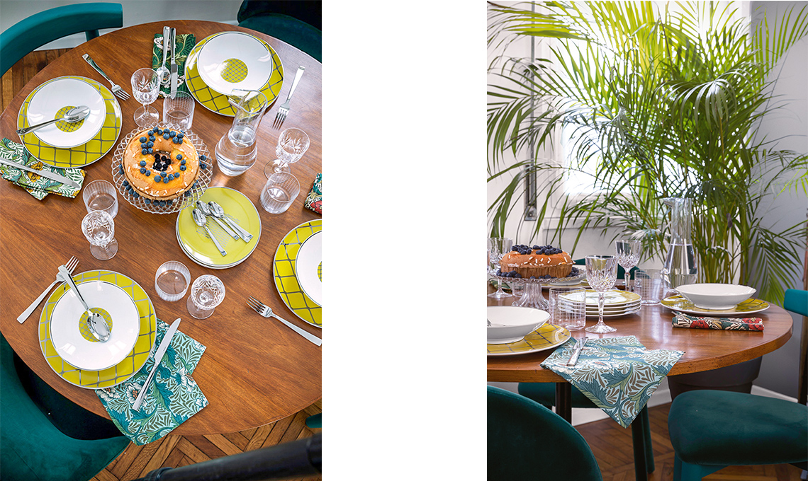 Il tavolo vintage [L’Albero], ha sedie in velluto Iola [€419 cad] e in legno Claretta Bold [Miniforms €419 e €495 cad]. Centrotavola [Paola Paronetto] e tazze [Nanban]. A destra, luce Parentesi [Flos].