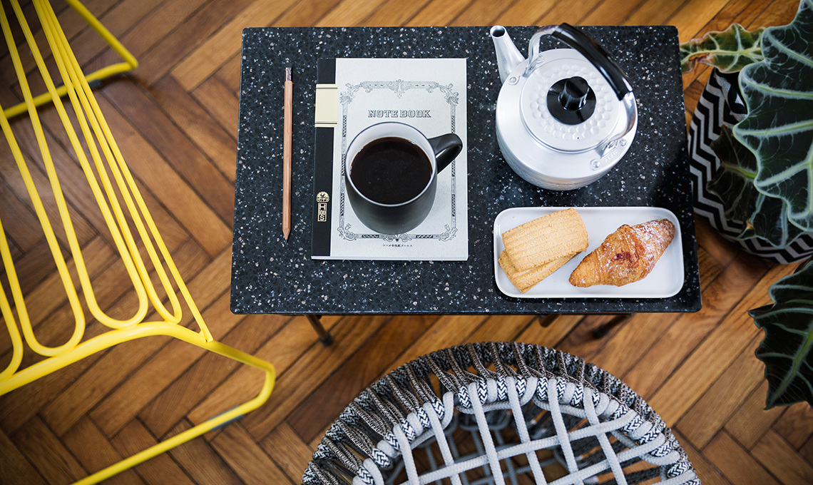 sgabello Jerry [Magis] e lampada [Astep €891]. Brocca e bicchiere [Nude], mug [Rosenthal].