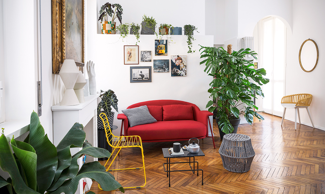 L’angolo relax è composto dal sofà Kepi rosso [cm 160x80x75h €2.230] di [Saba Italia] come il pouf grigio Ziggy [€650].