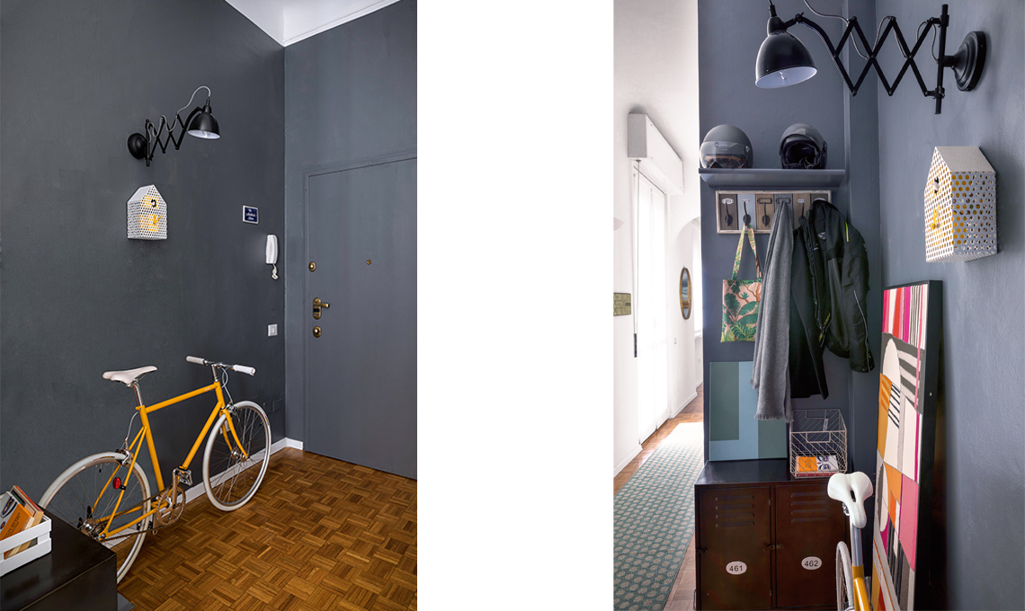 Sia le pareti sia la porta dell’ingresso sono state dipinte con la pittura London Grey 2021 [Wilson & Morris]. Orologio Oraora [Diamantini & Domeniconi €242], bicicletta [Tokyobike], lampada [Maisons