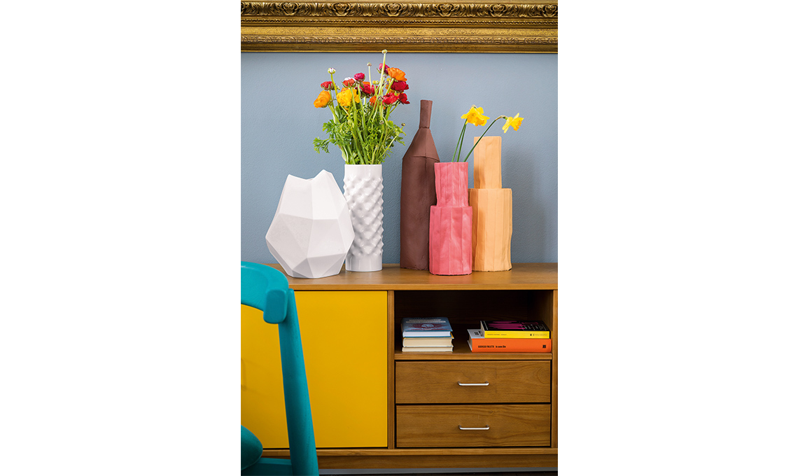 porcellana bianca Surface e Vibration [Rosenthal, cm 30h €340 e cm 32h €160] più vasi Cartocci [Paola Paronetto]. La parete è dipinta con lo smalto matt Graphite 2020 [Wilson & Morris].