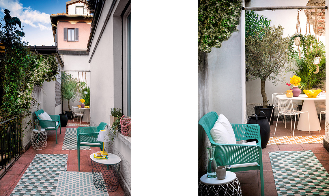 Sofà Net [Nardi Garden, cm 116x70x86h €207,40], tavolino [Magis] e cesta nera [Zara Home]. Nella zona pranzo: tavolo Ikon e sedie Nolita [Pedrali, ø cm 180 €1.404 e €157,50 cad]; sul top, centrotavola [Tête de Bois], vaso [Ikea], brocca [Casa Croff] e vassoio [Nanban]. Tappeti [Pappelina], piante [Viridea].