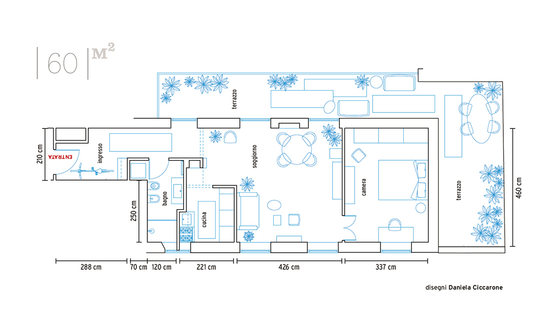 Un ingresso tortuoso, un bagno datato e una mini cucina male organizzata, in più camera e soggiorno sovraccarichi. Martina prende in affitto questo appartamento luminoso e con un grande terrazzo, che ha bisogno di un grande restyling.