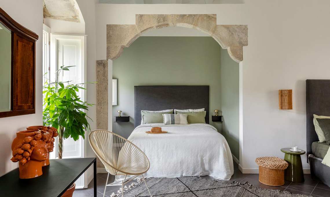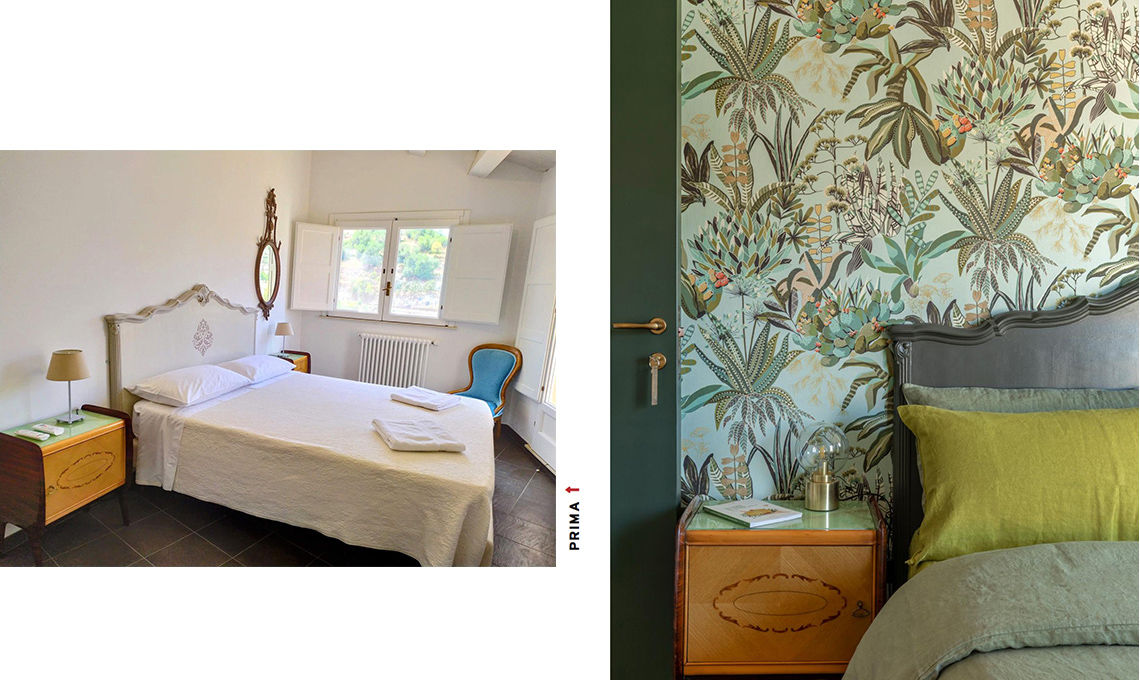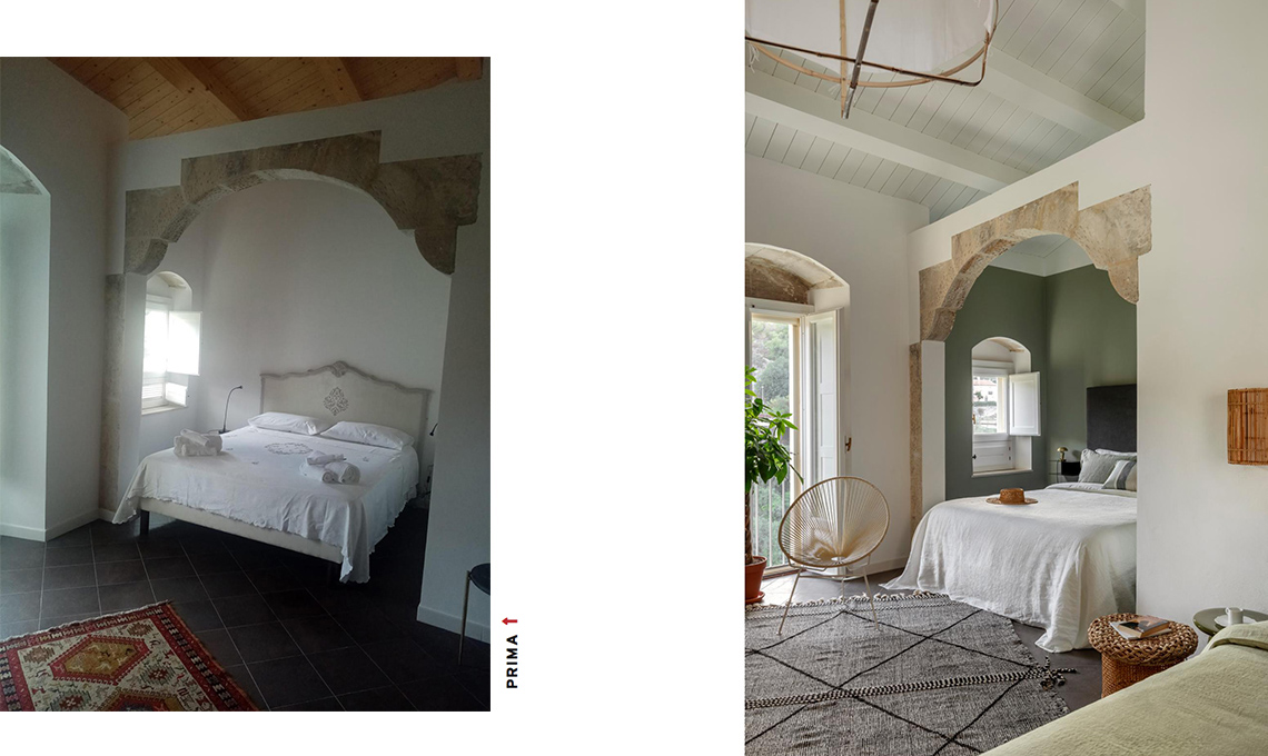 La camera quadrupla, chiamata Foresteria, aveva soffitti in perlinato giallo e uno splendido arco di pietra, risalente all’anno di costruzione, il 1890. La sensazione di piattezza cromatica data dal bianco e di disarmonia data dal giallo delle travi faceva il paio con gli arredi, che sembravano piccoli e bassi rispetto al ‘respiro’ volumetrico della stanza. Il primo passo è stato quello di sbiancare le travi, poi di portare un verde nella nicchia: il colore l’avvolge come una coperta ed esalta la pietra smerlata dell’arco. Quindi si è pensato a nuove testiere (su disegno di Atypique Design): imponenti, proporzionate all’altezza delle pareti, a cui si allineano le applique in rattan.