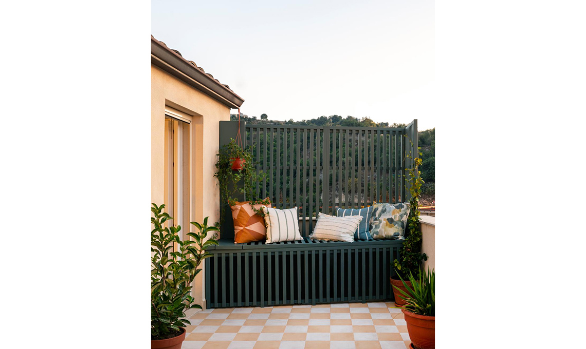 Panca/paravento e gazebo realizzati su disegno di Atypique Design Studio. Mix di cuscini [Villa Nova] e [Kirkby Design].