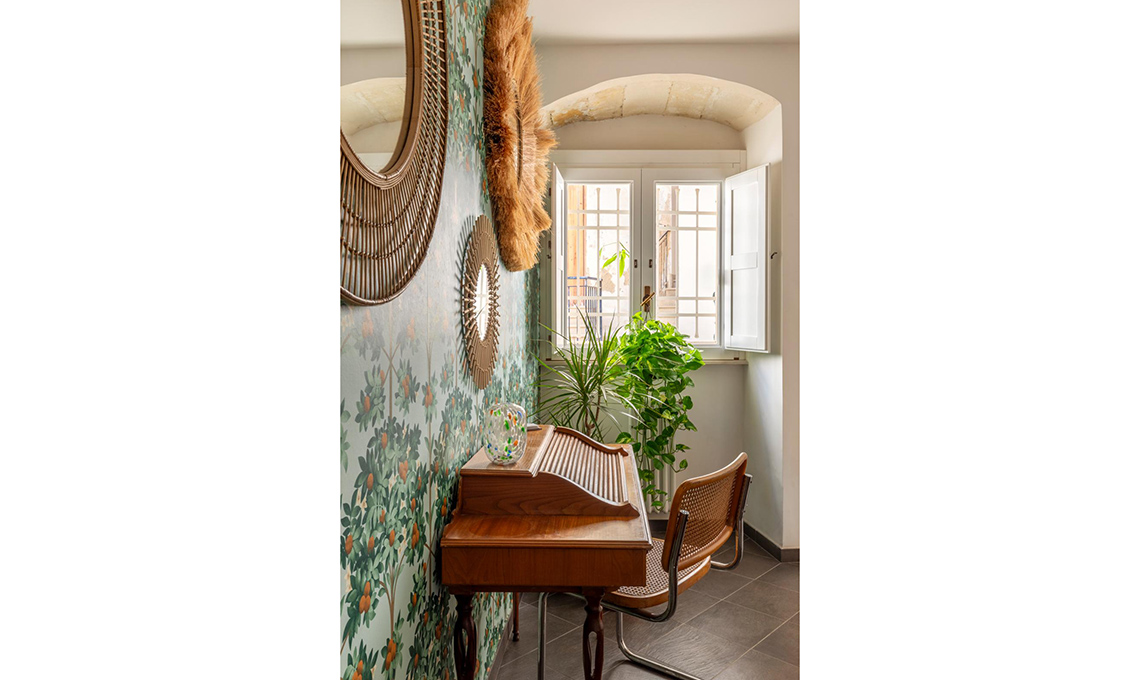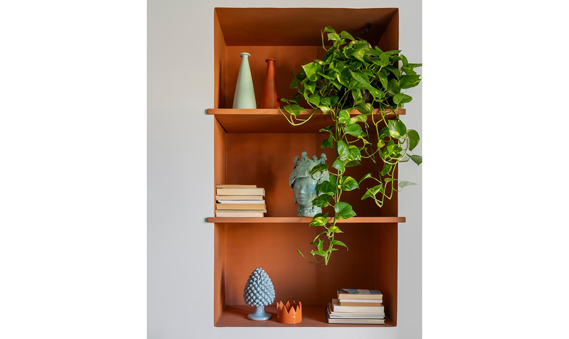 Nella nicchia testa di moro Pop, vasi, pigna e coroncina (ispirata a quella di Jean-Michel Basquiat) di [Folk Magda Masano]. Poltroncina e scala in bambù [Lene Bjerre da Corredo con Stile @ragonacorredo]. Cuscino Stipa [Villa Nova], tavolino Tamburo [Atipico], tappeto Jute Border [Nordic Knots]. Sul comò, carciofi in ceramica [Crita Ceramiche]. Nella nicchia, pittura Fired Clay di [The Paint Makers Co.].