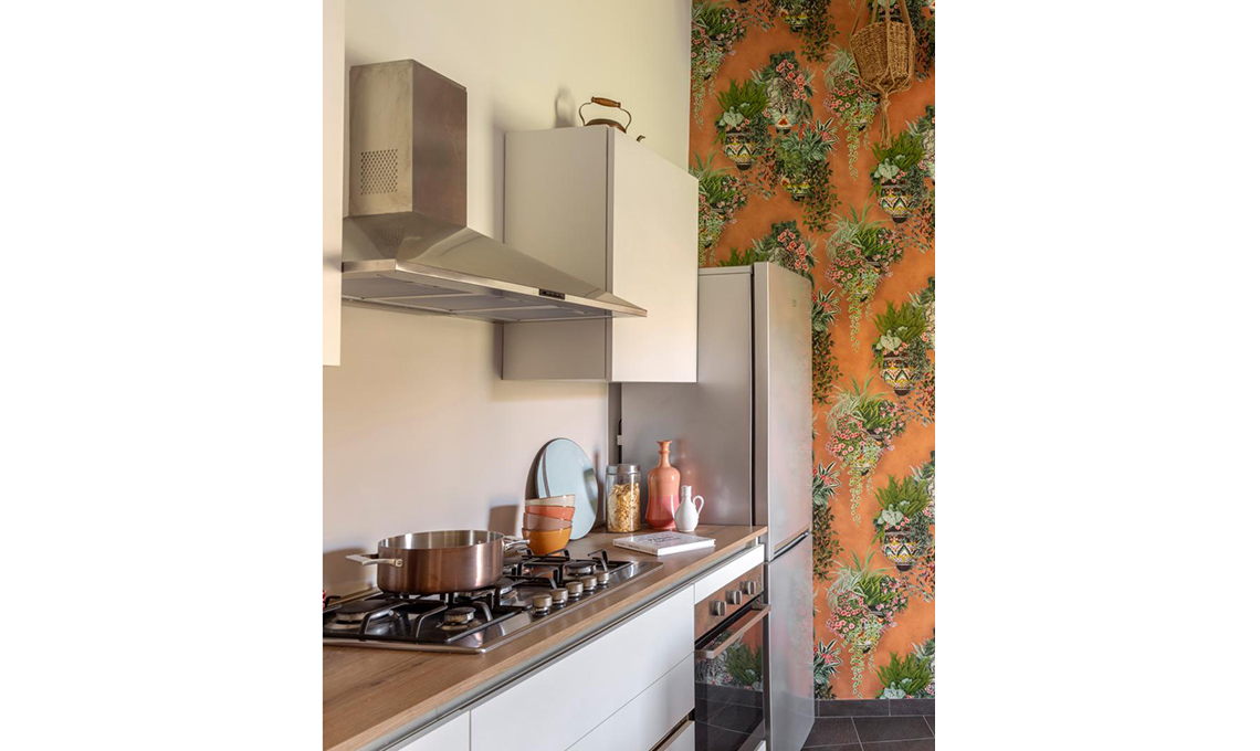 Bianca, la cucina non presentava nessun punto di interesse: gliel’abbiamo creato con una cascata immaginaria di fiori e piante disegnata dentro vasi tradizionali. L’effetto è quello di un giardino indoor.