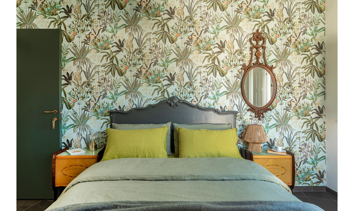 di riprendere il verde della carta e dare un accento acido con i cuscini, per illuminare; nella camera precedente, invece, si ravviva la nicchia salvia con una parure color burro.