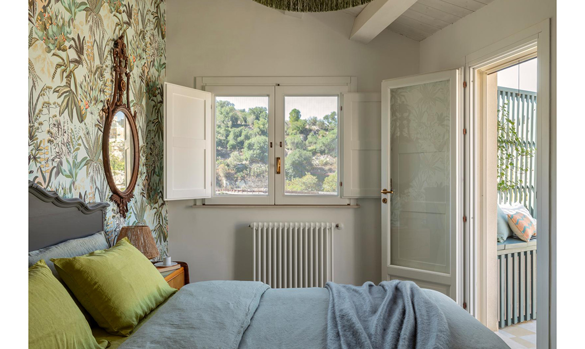Carta da parati Figari [Lelièvre da Sezzi Interiors], parure tessile in lino [La Fabbrica del Lino]. Testata ridipinta con pittura Bogardus Grey e porta con pittura Forest Dusk, entrambe [The Paint Makers Co.]