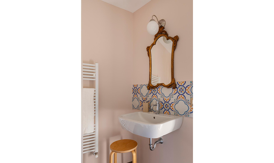 Il piccolo paraschizzi di piastrelle decorate a mano impreziosisce l’estetica di un bagno basic. Sì all’applique minimal sopra la cornice d’epoca. Piccola spesa, massima eleganza!