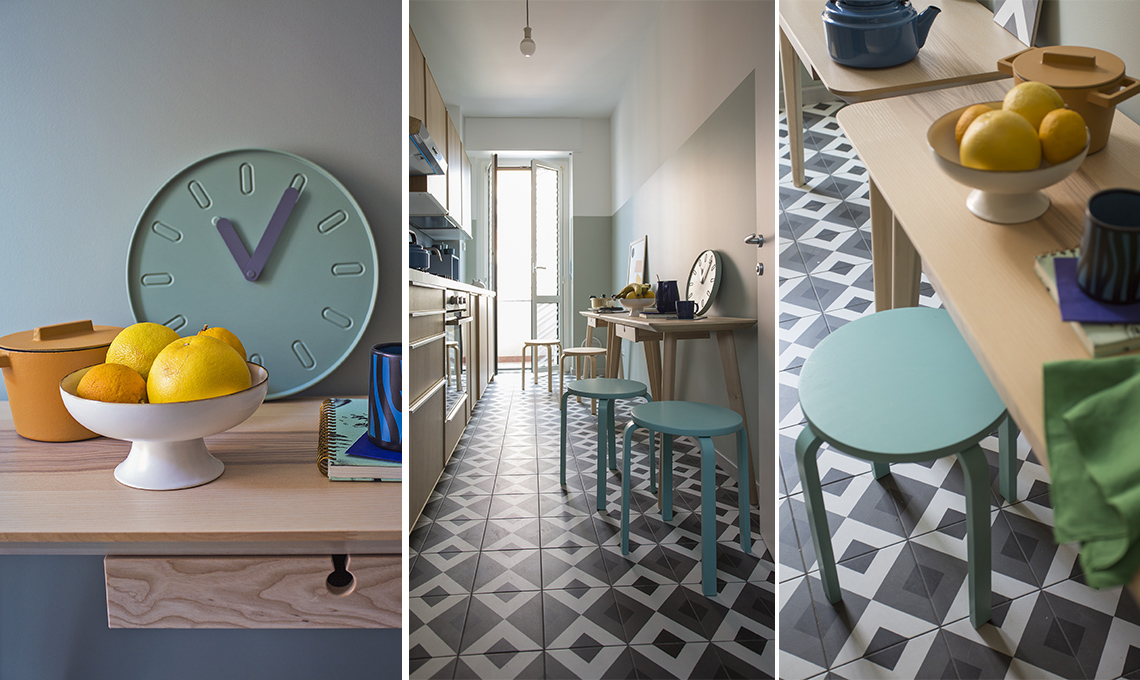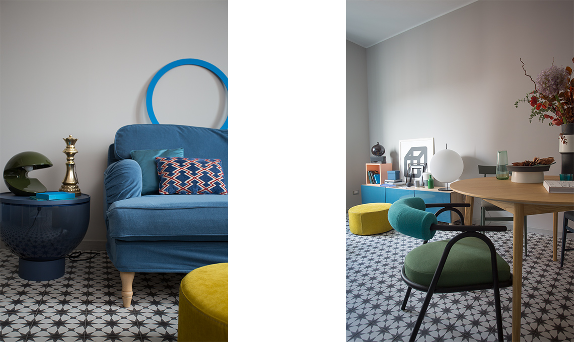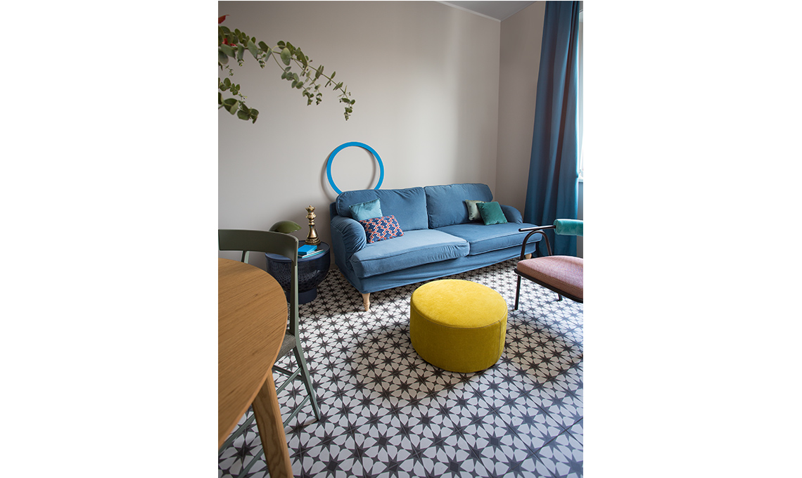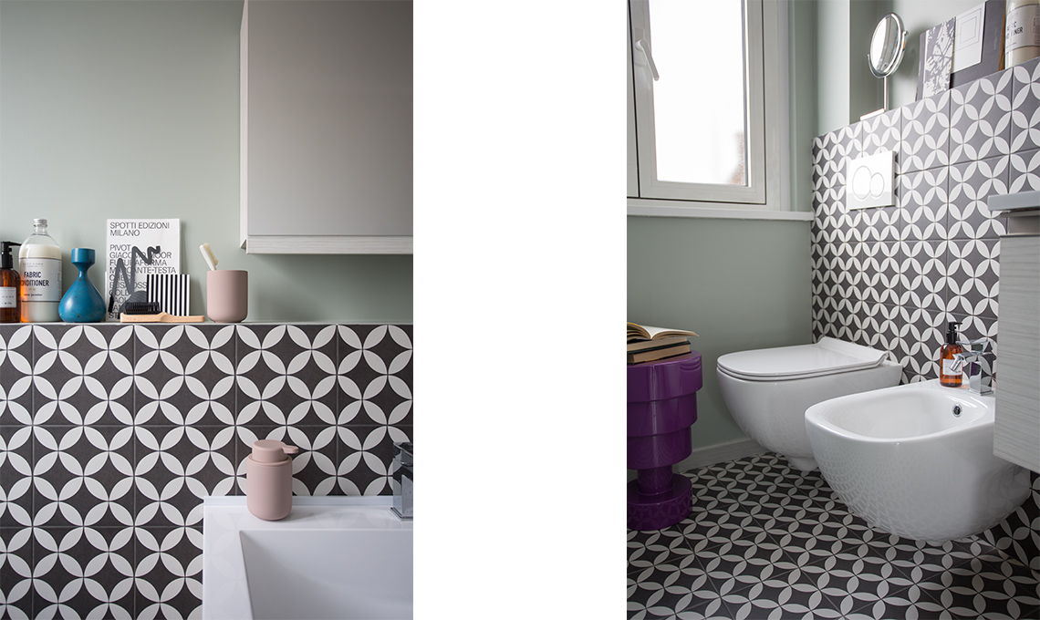 Giovanna ha proposto di partire da una scelta di carattere per i pavimenti: posare, al posto del classico parquet, delle piastrelle effetto cementine. Tutte black&white e soprattutto con un decoro diverso in ogni ambiente! Dopo un primo momento dubbioso, viste però le moodboard con i colori da abbinare, i proprietari hanno trovato l’idea affascinante al punto da ripeterla anche nel bagno. Trattandosi di un bilocale, poi, le idee salvaspazio non mancano: dal letto contenitore al tavolo allungabile, dalla cucina superattrezzata (compresa di lavatrice) alle sedute passepartout.