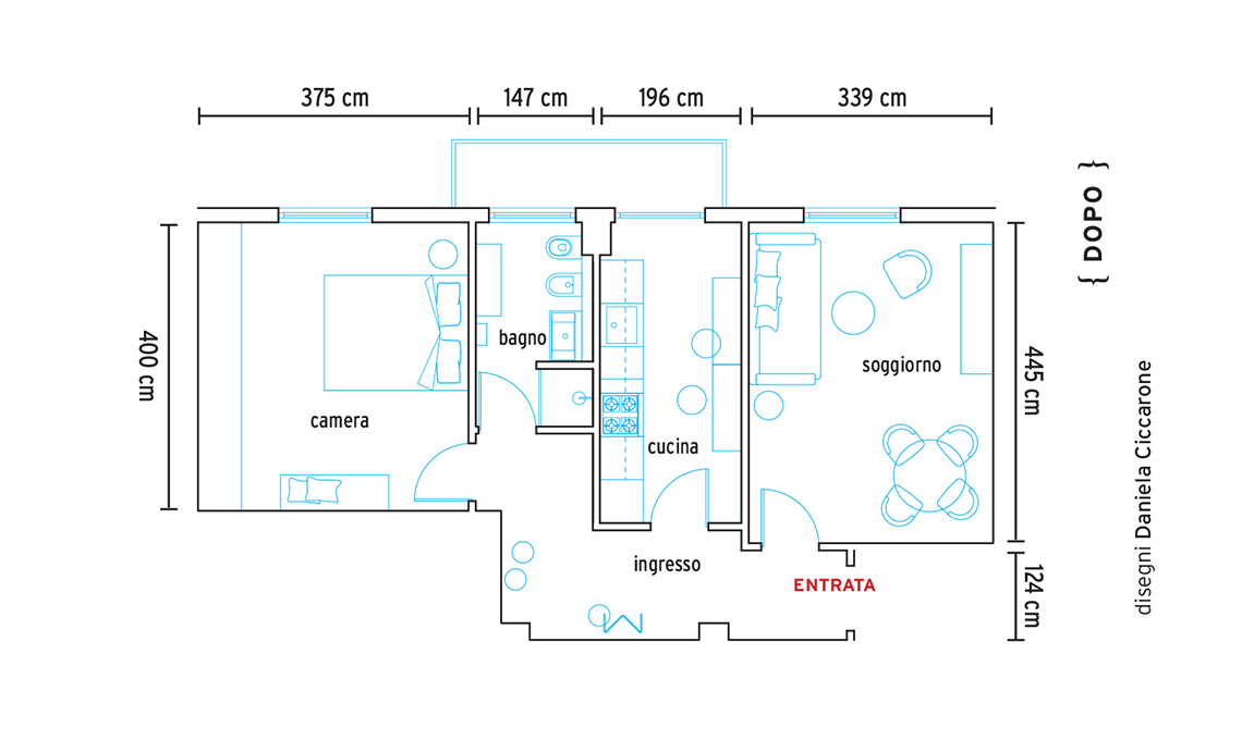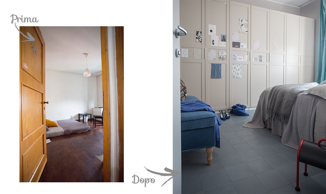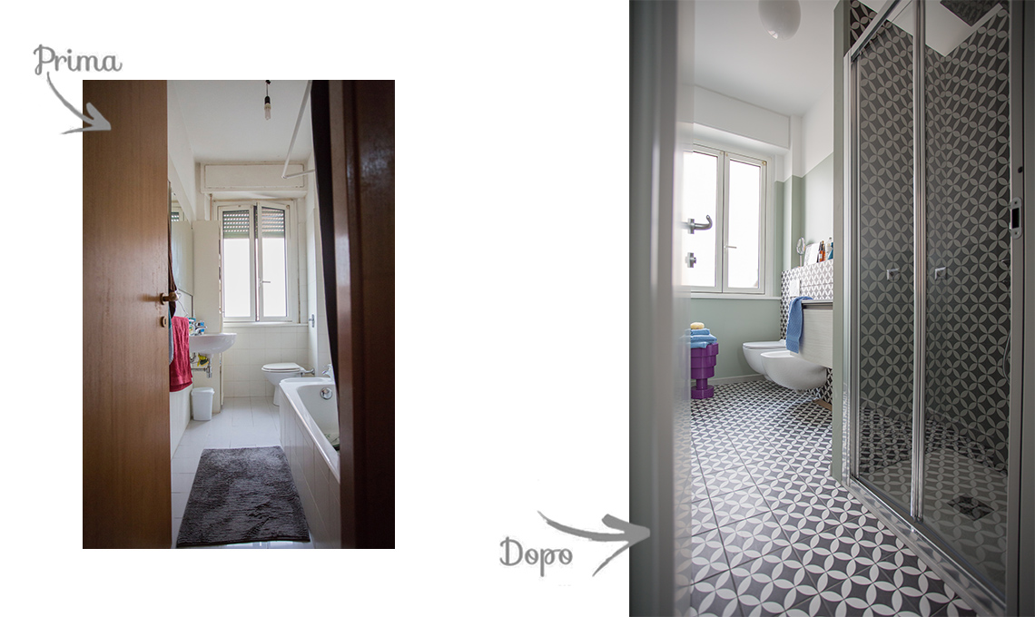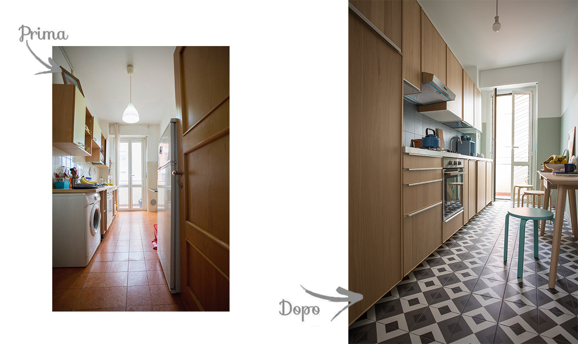 Giovanna ha proposto di partire da una scelta di carattere per i pavimenti: posare, al posto del classico parquet, delle piastrelle effetto cementine. Tutte black&white e soprattutto con un decoro diverso in ogni ambiente! Dopo un primo momento dubbioso, viste però le moodboard con i colori da abbinare, i proprietari hanno trovato l’idea affascinante al punto da ripeterla anche nel bagno. Trattandosi di un bilocale, poi, le idee salvaspazio non mancano: dal letto contenitore al tavolo allungabile, dalla cucina superattrezzata (compresa di lavatrice) alle sedute passepartout.
