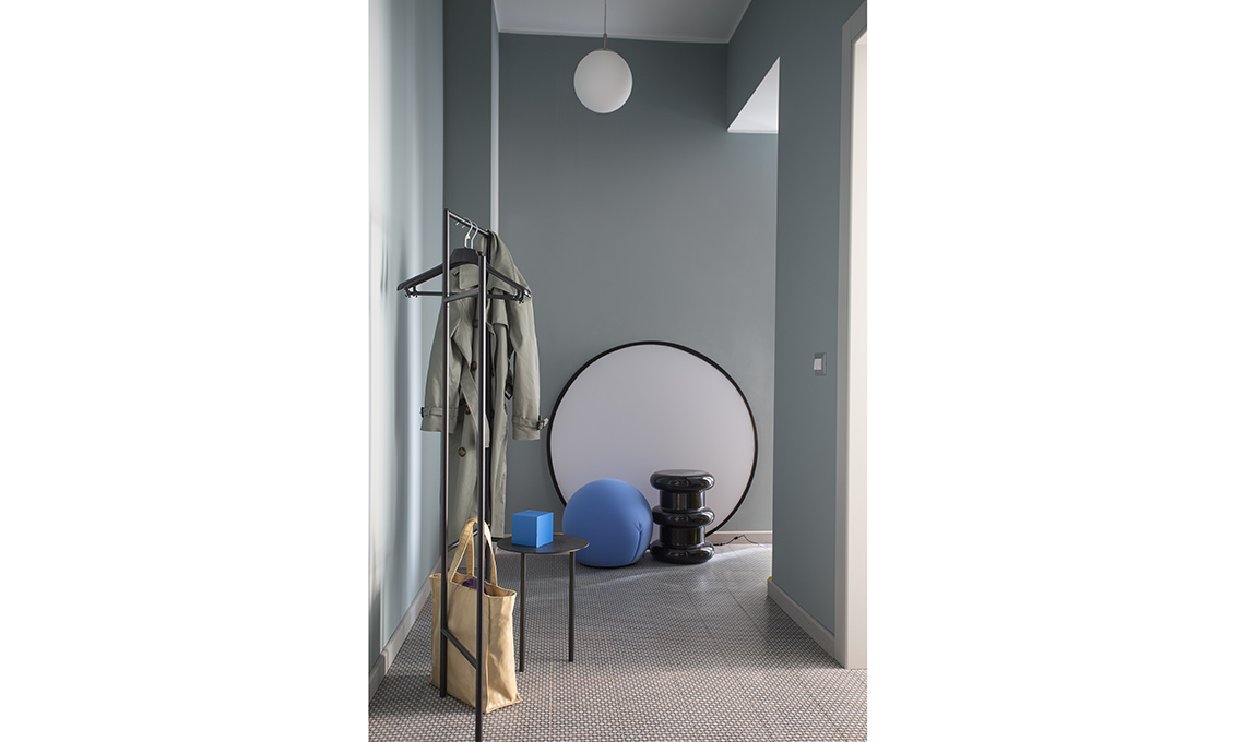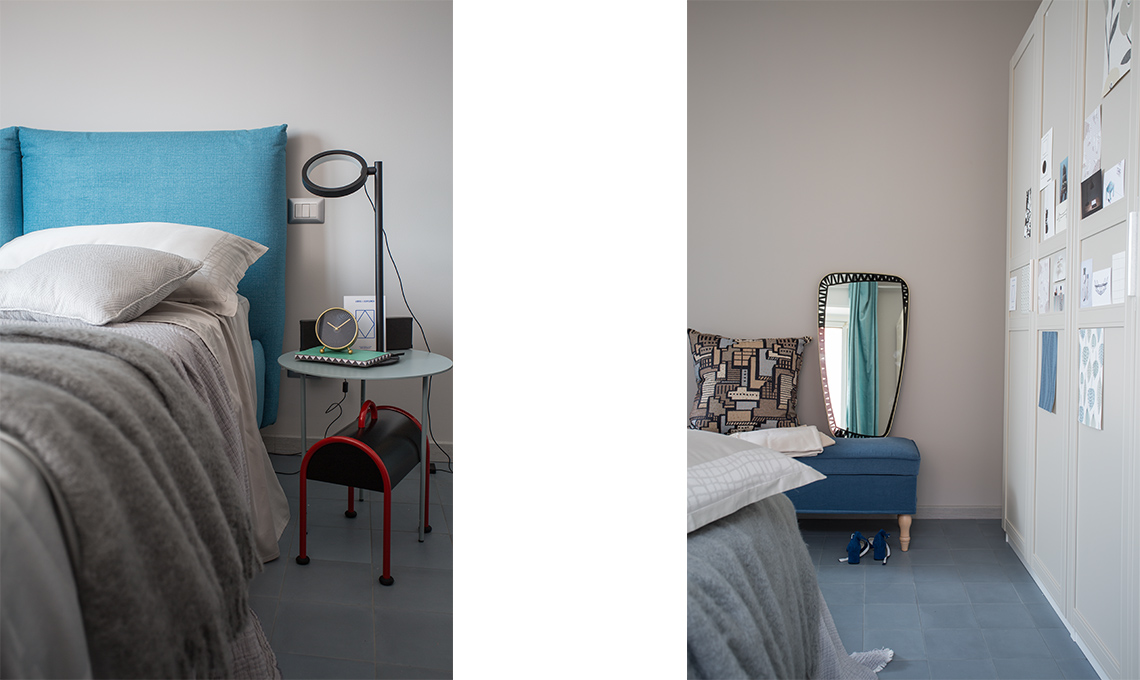Pattern così d’impatto sono stati abbinati a tinte delicate che sfumano dal rosa cipria al sabbia, dall’azzurro polvere all’ottanio. L’ingresso della casa è quasi una moodboard: racconta, con pochi elementi, le scelte di stile. Dalle piastrelle optical agli accessori di design ‘hard’. Nella camera da letto, il grande armadio bianco che occupa tutta la parete è stato personalizzato con ritagli di tappezzerie e foto fissate con i washi tape.