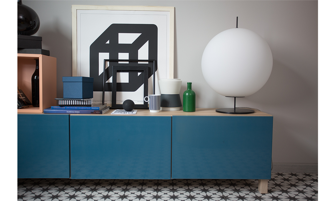 Madia Bestå con modulo a giorno Eket [Ikea, cm 180x40x74h €145 e €15], lampada [DePadova €1.100], serigrafia Undici, Cubo di Enzo Mari [Danese Milano] e mug [Asa]. piastrelle D_Segni [Marazzi].