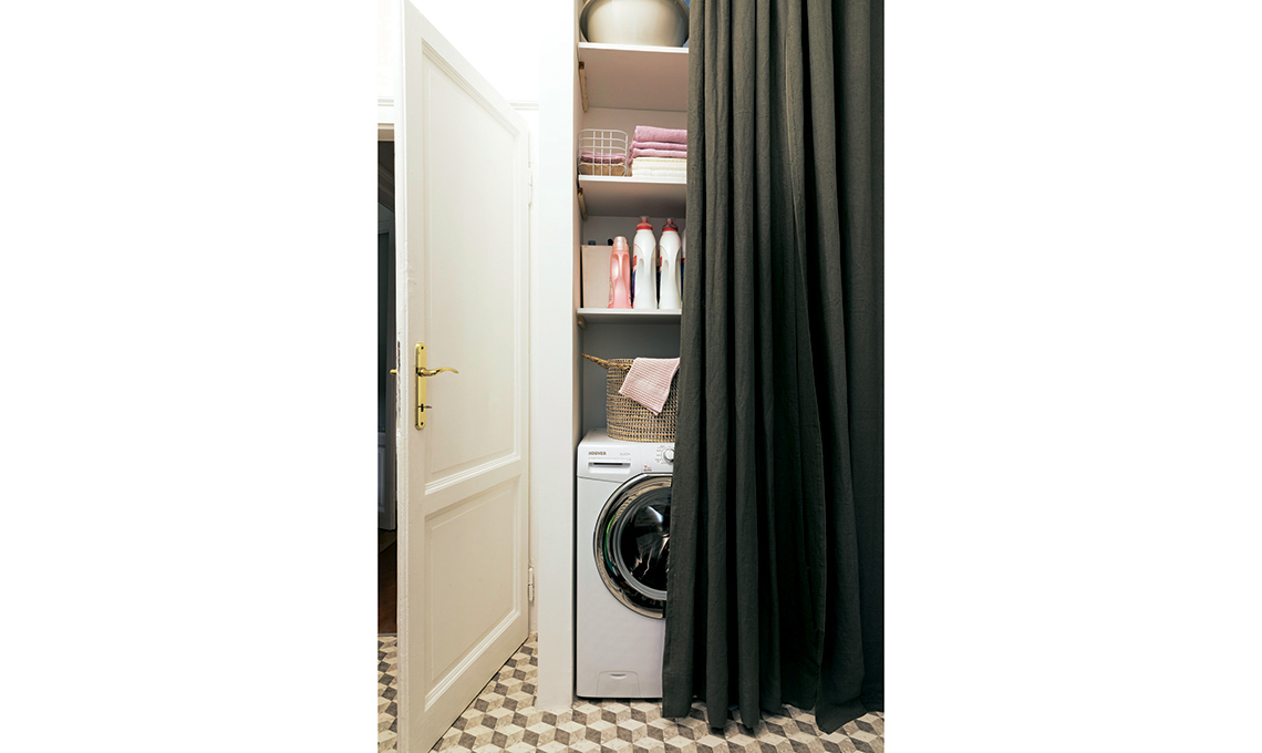 Grazie a due quinte a tutta altezza e profonde 50 cm, dietro la porta lo spazio è stato sfruttato appieno con due nicchie attrezzate con ripiani, che ospitano la zona lavanderia (con lavatrice a profondità ridotta) e un comodo ripostiglio. Per chiuderli ci sono due eleganti tende in lino pesante color antracite [Romo]. Una scelta décor semplice e super pratica!