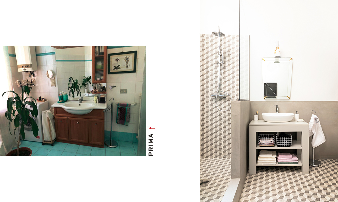 Sopra il mobile lavabo realizzato su misura, specchio vintage da [Vecchio Mio]; cassettiera vintage acquistata su [subito.it]. Asciugamani bianchi [Orla Kiely].