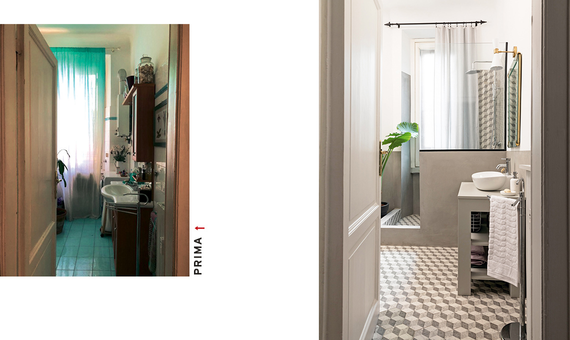 A terra, piastrelle esagonali in grès effetto marmo Allmarble altissimo decoro Geometria [Marazzi, cm 21x18,20 € 51,50/mq], a parete, rivestimento Petra color Sasso steso a mano [Wilson & Morris]. Alla finestra, tenda in tessuto trattato impermeabile e antimuffa confezionata da [I Vigna].