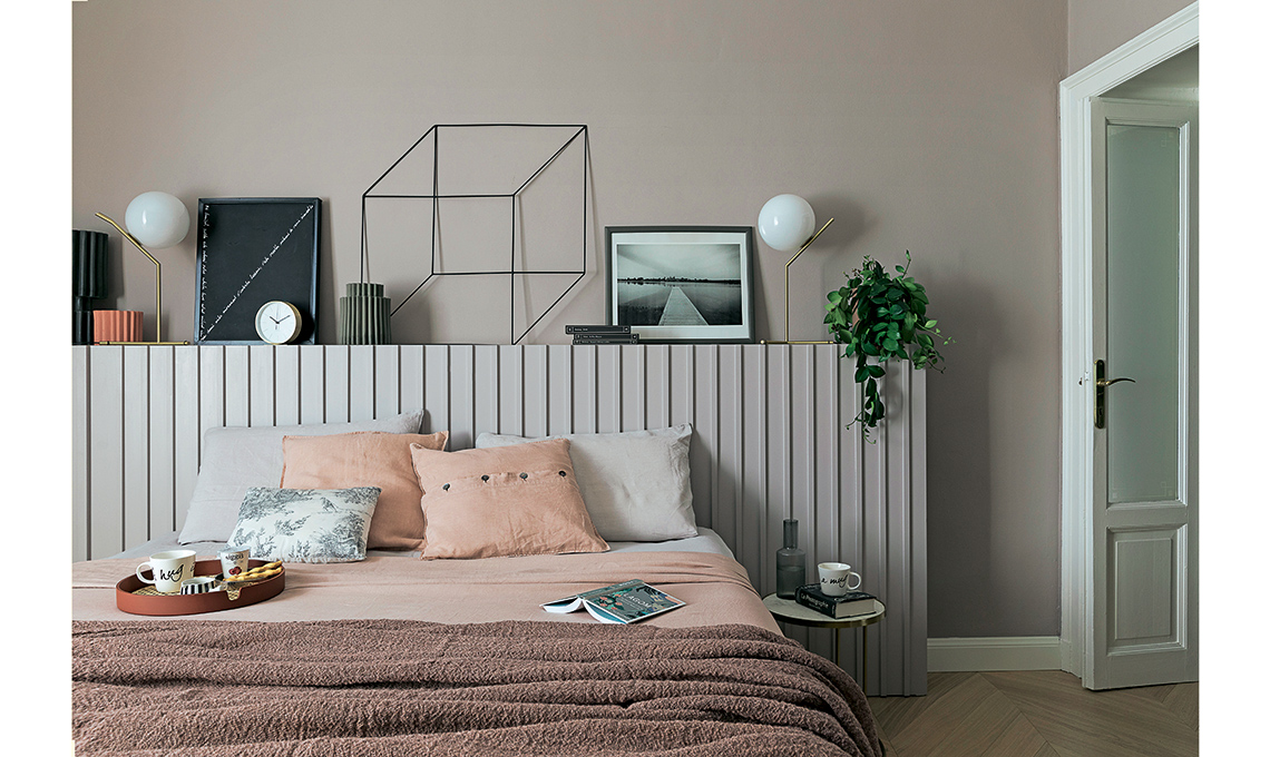 Letto Sommier con box contenitore, rivestito in tessuto Nobil Bond categoria Plus [PerDormire, per rete da cm 180x200 € 824] con copripiumino matrimoniale e 2 cuscini con fodere Rem Verbena in lino da cm 50x50 [€ 460 e € 120] di [Society Limonta] come il plaid Ted Rosa Tea [cm 160x240 € 285]. Sulla boiserie realizzata su misura [Falegnameria Fallacara] e dipinta con smalto colore C8.04.67 [Sikkens], vasi Le Torri e I Flessi [Francesca Verardo], lampada IC Light [Flos € 440]. Orologio [House Doctor], quadro [Christopher Pisk], scultura Cubo [Antonino Sciortino], specchio [Umbra].
