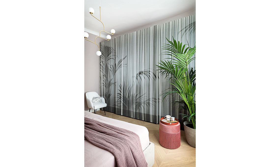 Le ante scorrevoli dell’armadio sono rivestite con la carta da parati Elisir, disponibile su supporto vinilico