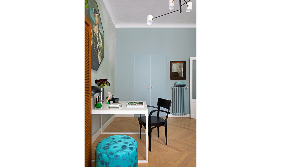 Sul tavolo Fronzoni [Cappellini], portaoggetti Toolbox nero [Vitra € 36], vaso [OYOY], calendario Timor [Danese € 124], kokeshi doll Frida [Lucie Kaas € 44] e lampada a olio [AKI]. La mano decorativa sul mobile a serrandina e il pouf rivestito con tessuto [Rubelli] sono di [Vito Nesta]; accanto alla finestra, 4 fotografie Burlesque [Giandomenico Frassi].