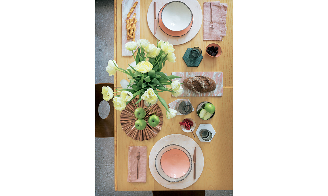 [ø cm 40 € 180 cad], sottobicchieri [da € 40 cad] e taglieri in marmo [€ 90 cad], tutto di [Espi Design]; brocca e bicchieri Ripple Smoked Grey [Ferm living, € 35 e € 39 il set da 4], piatti