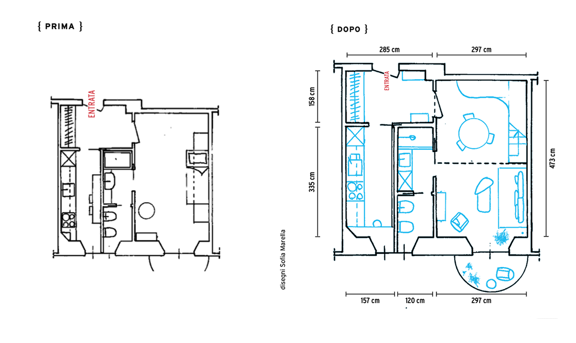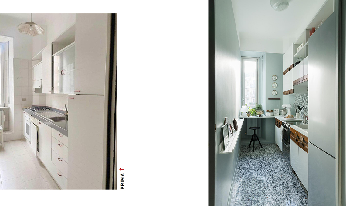 La grande altezza (cm 335) ha suggerito di realizzare un letto a soppalco nel locale principale: «Volevo creare delle zone ben distinte e non avere la sensazione di dormire in soggiorno: sotto il letto c’è l’angolo pranzo, mentre l’area relax con il divano sembra addirittura a doppia altezza!» dice. Qui lo spazio è organizzato al millimetro per il contenimento, con l’armadio a muro in ingresso, la scaffalatura nascosta dietro la tenda sotto il letto-soppalco e i pensili a doppia altezza in cucina.