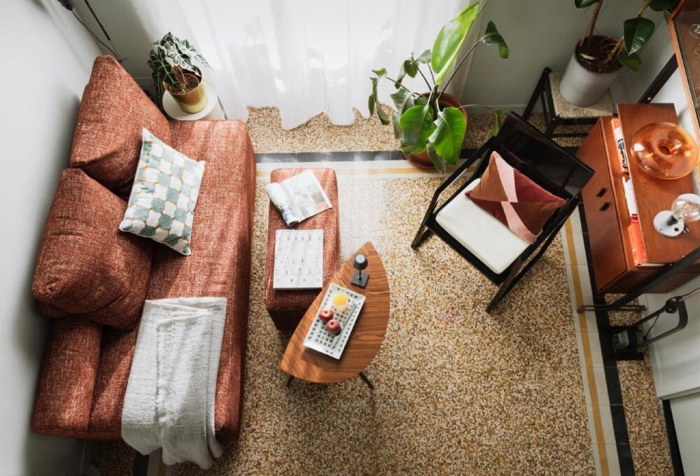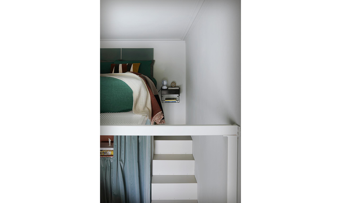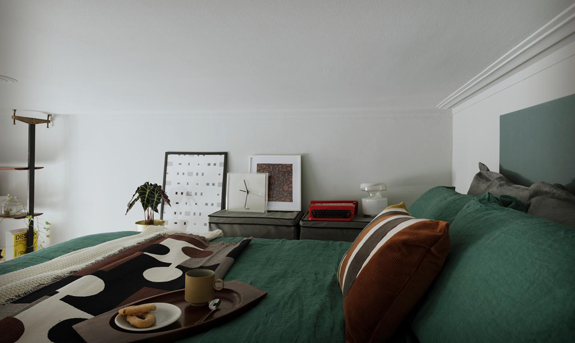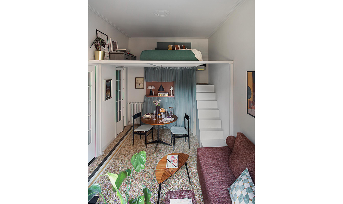 Il trucco per moltiplicare lo spazio in una casa piccola? Un letto sopraelevato e contenitori che sfruttano ogni centimetro. E per dare personalità, arredi e colori vintage.