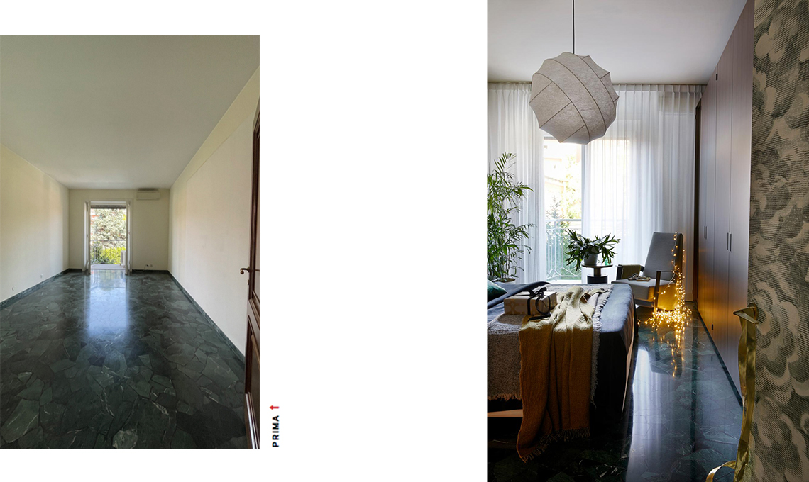 Anche in camera spiccava il pavimento in marmo verde in una scatola total white. Qui, per dare carattere si