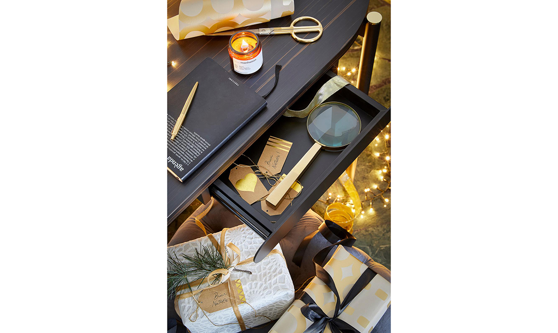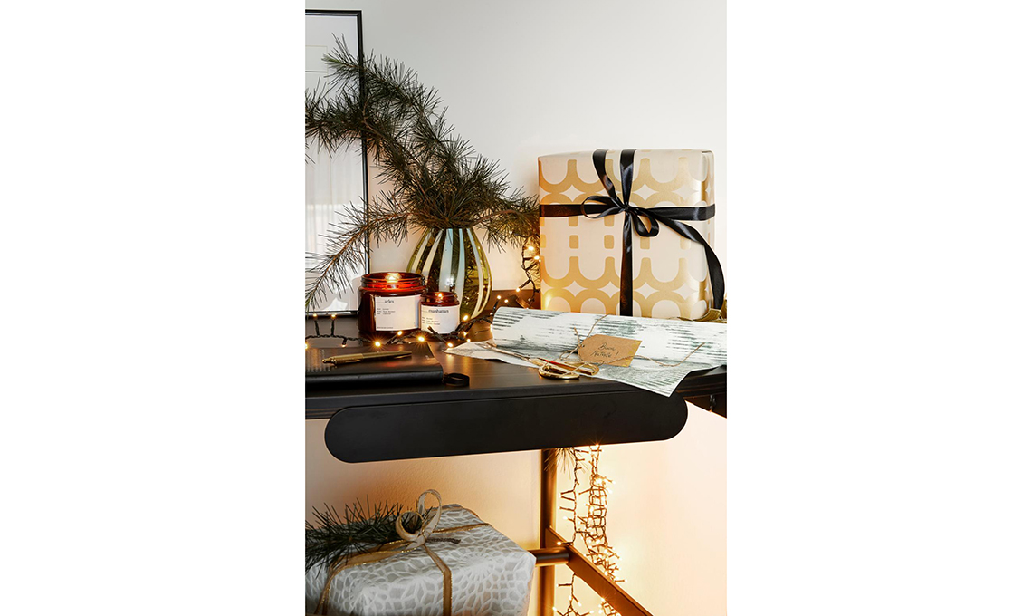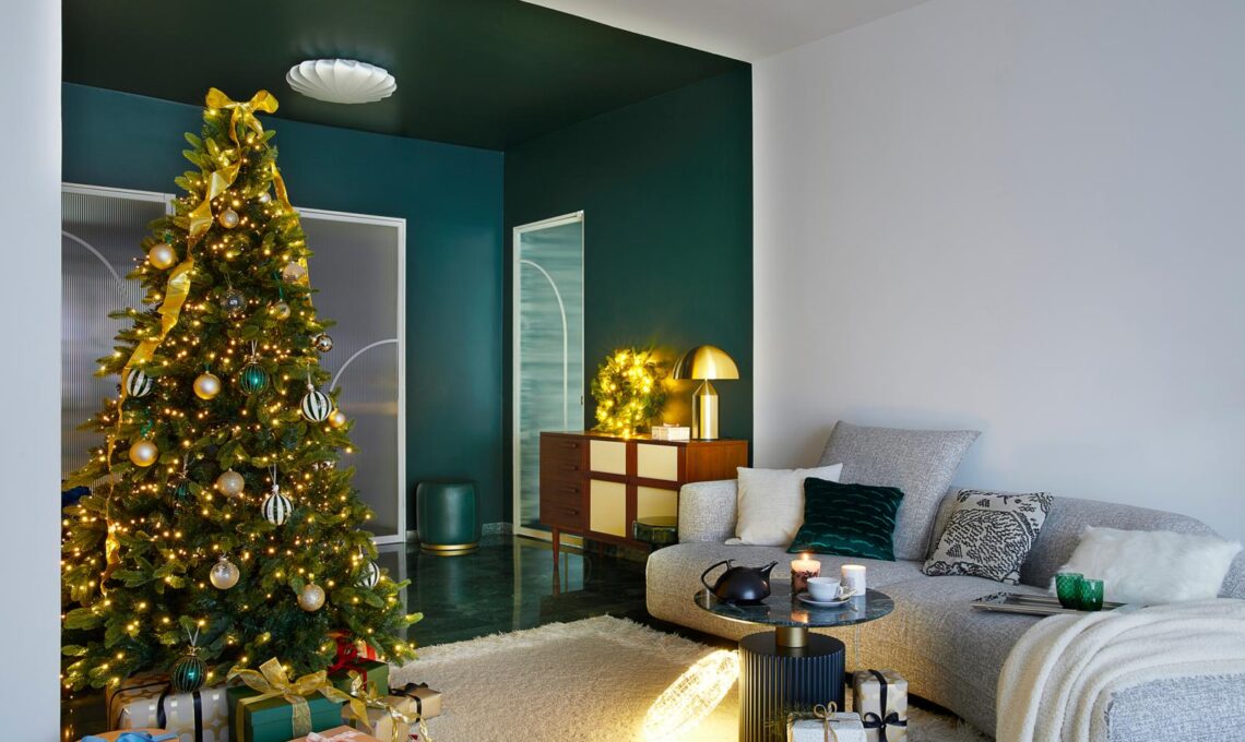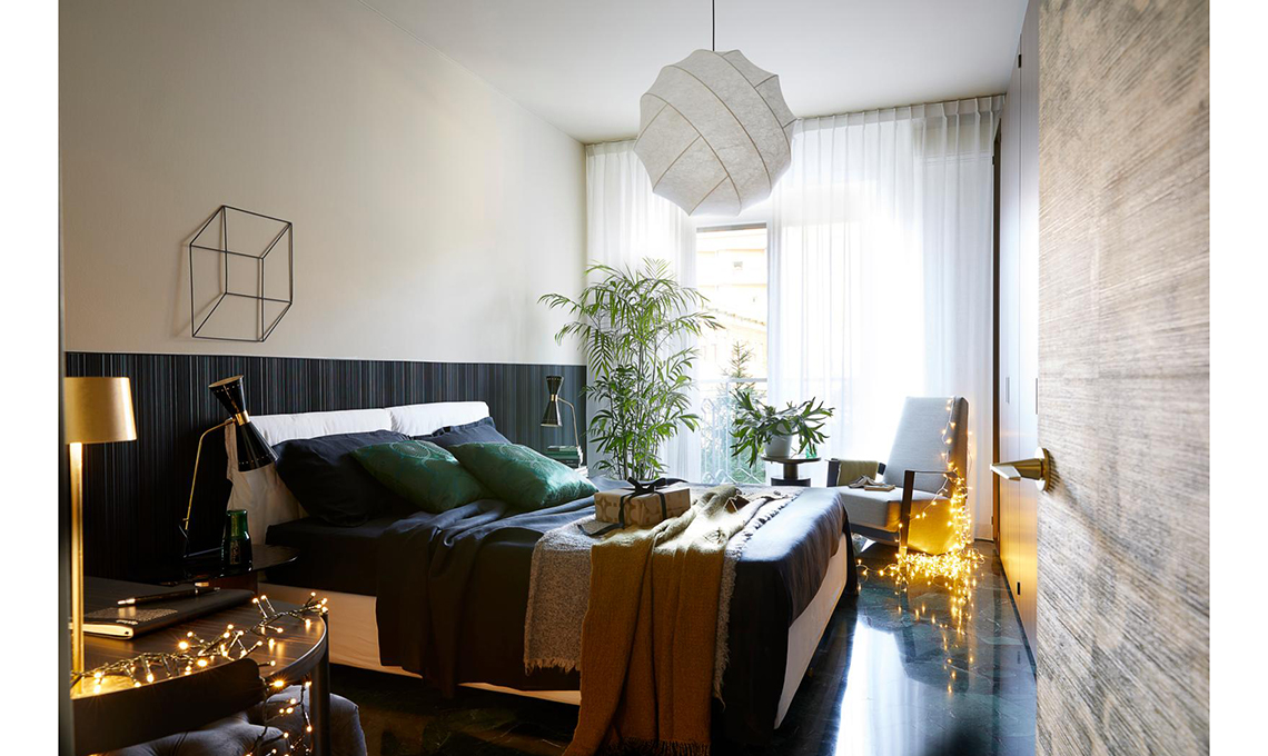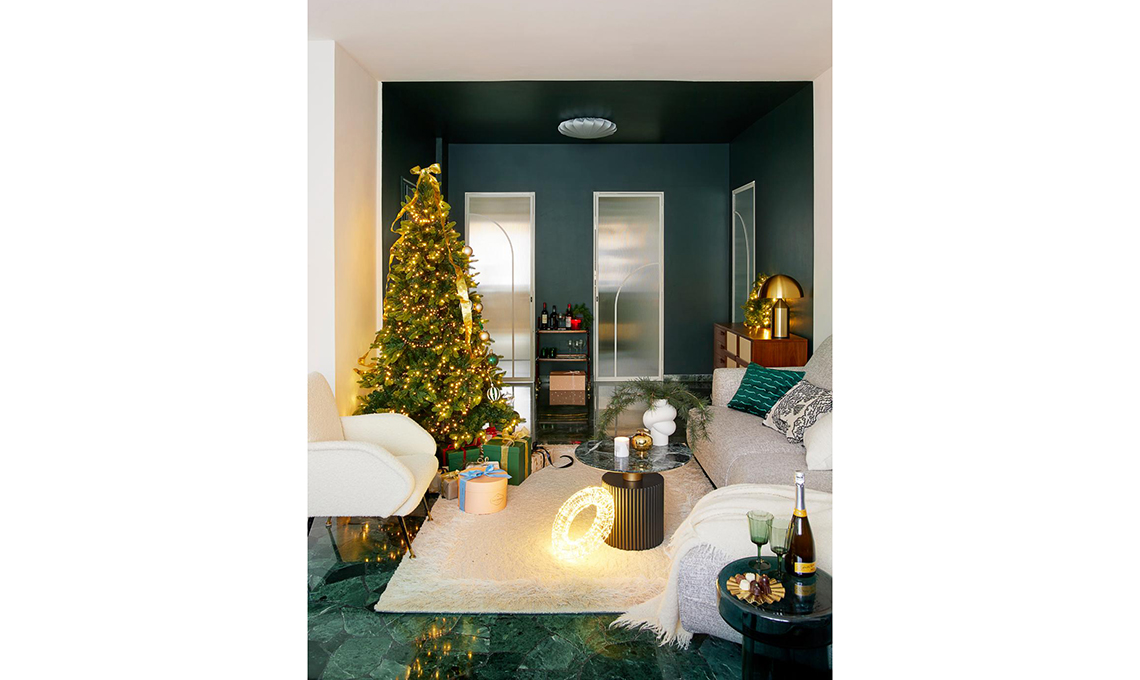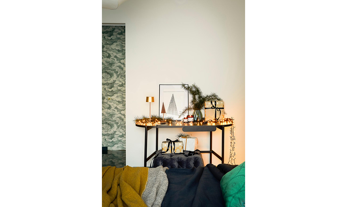 è usato un color corda alle pareti, insieme a dettagli geometrici ben definiti, in nero. E tocchi dorati per dare luce, esaltati dalle ghirlande luminose natalizie.