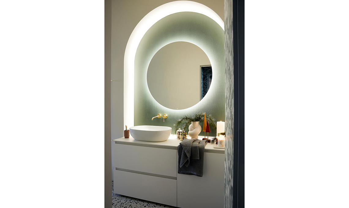 Il motivo dell’arco, preannunciato sulle porte della zona giorno, qui si fa marcato e viene riproposto in modo evidente sia sulla parete che chiude la doccia, sia nelle tre nicchie che inquadrano le zone lavabo, sanitari e, appunto, doccia. E, come nell’ingresso, anche qui, il bianco dei vari elementi spicca sulle porzioni di pareti rivestite con una resina verde scuro che definisce anche il piatto walk-in in muratura, a contrasto con il pavimento in graniglia che riprende quello della cucina.