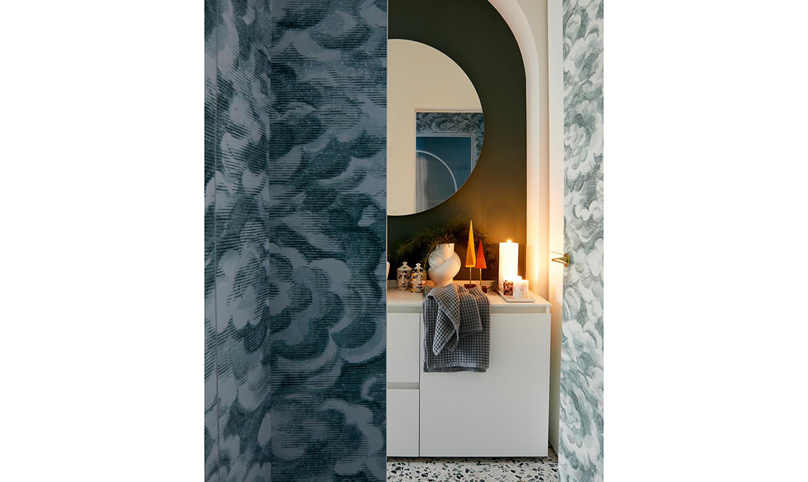 La parte più impegnativa del progetto riguarda i servizi: «Per avere una grande cucina, d’accordo con Annalisa, è stato eliminato il bagno piccolo» dice Vanessa. «In questo modo l’ambiente è quasi raddoppiato e l’isola al centro è perfetta per cene conviviali e come piano di lavoro». Il bagno padronale è stato totalmente rivisto con la creazione di grandi archi in cartongesso dal fondo verde bosco. Questo colore è il leitmotiv della casa: ispirato dal pavimento, è stato usato anche nell’ingresso per un avvolgente effetto scatola, e sulla wallpaper del disimpegno.