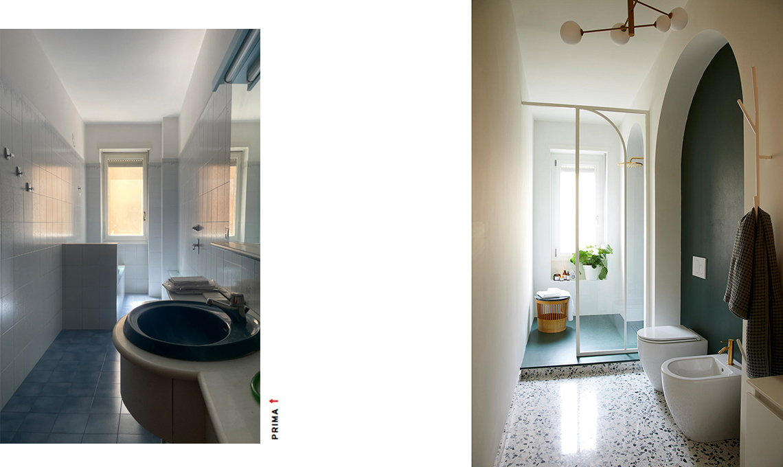 Il bagno lungo e stretto rispecchiava in pieno lo stile in voga negli anni ’80, epoca della precedente ristrutturazione. Qui la rivoluzione è stata totale: una grande doccia al posto della vasca, e una sequenza di archi che definiscono le diverse aree. E dietro la porta, c’è anche un armadio con la lavanderia.