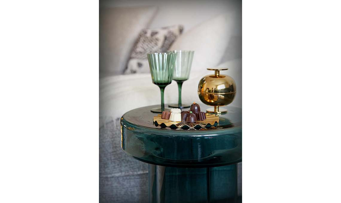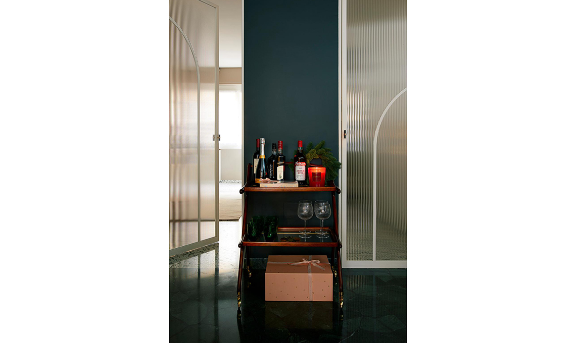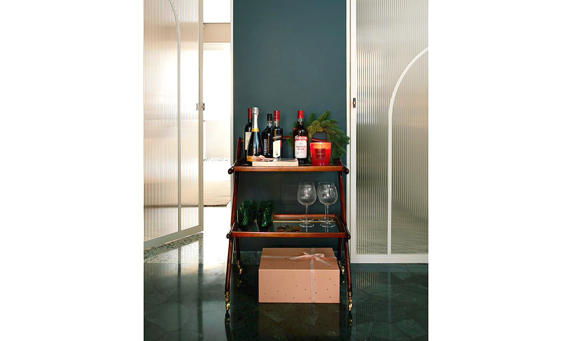 Sul carrello bar [Vecchio Mio], bottiglie di vino [Cantine Toso] e American Bitter [Franzini], candela e ghirlanda [Croff], bicchieri Idra e calici Tolomeo [Nason Moretti], sottobicchiere Kyma [Rosenthal], scatola [Sant Ambroeus].