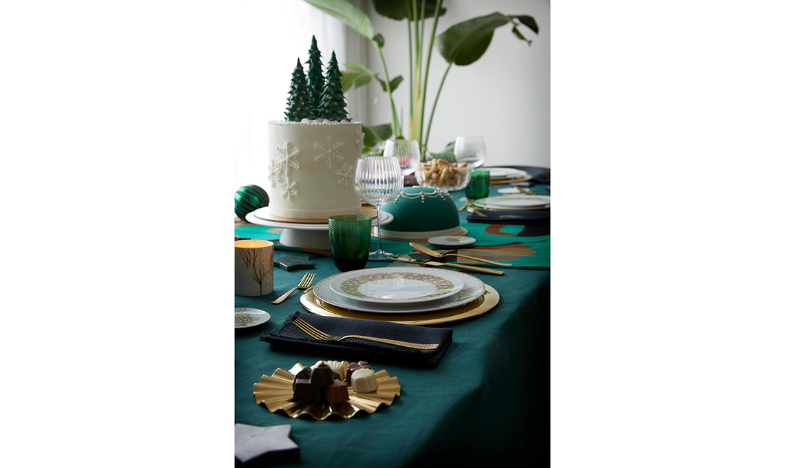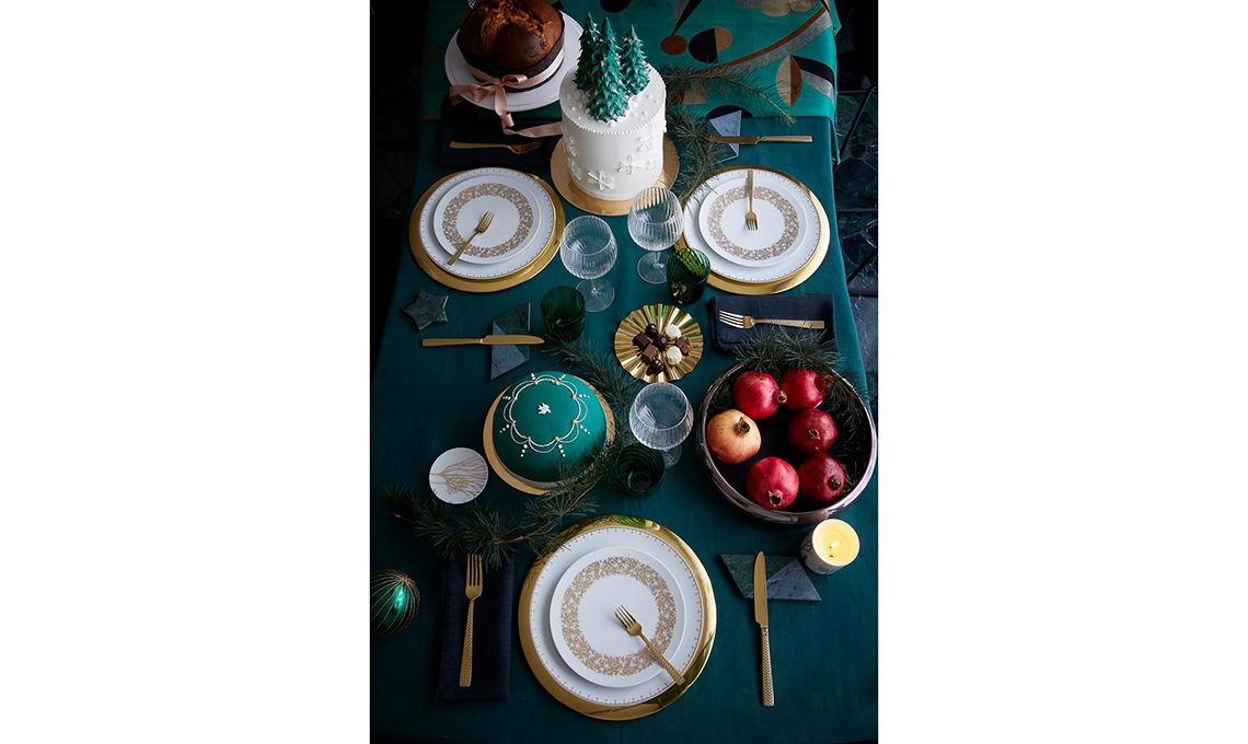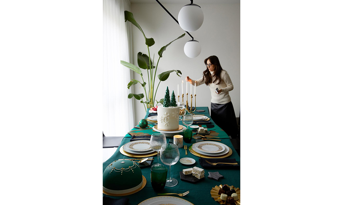 La mise en place: tovaglia in lino filo bosco–gold [cm 220x320] e tovaglioli in lino Evelina color carbone [cm 45x45] di [Borgo delle Tovaglie], runner realizzato con tessuto Manifesto Futurista color smeraldo [Dedar]; candelabro Kyma in mirror PVD gold [ø cm 25x30h] di [Sambonet] come il piatto da portata Sfera in acciaio oro [ø cm 32], le posate e le forchettine da dolce Cortina, il vassoio Sphera in acciaio inox mirror PVD rum e il piattino pane Kyma. Calici da vino rosso Tolomeo Rigadin e bicchieri Idra verde lauro di [Nason Moretti], piatti piani TAC Festive Celebration [Rosenthal]. Palline in vetro e ghirlanda con luci Led [Croff], stelle in marmo verde Guatemala e marmo nero Marquina coll. Paola Speranza [Espi Design]. torta, panettone e dolci [Sant Ambroeus].