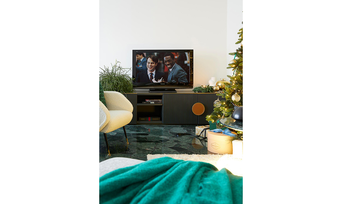 Sul mobile tv Wide in laccato grigio granito opaco con top in vetro laccato grigio tenda con profilo ottone [Scappini Home], coppetta e centrotavola in acciaio inox mirror PVD gold [Sambonet]. albero di Natale, palline decorative in vetro, ghirlande e luci [Croff], poltroncina vintage rivestita in tessuto Nimbus [Dedar].