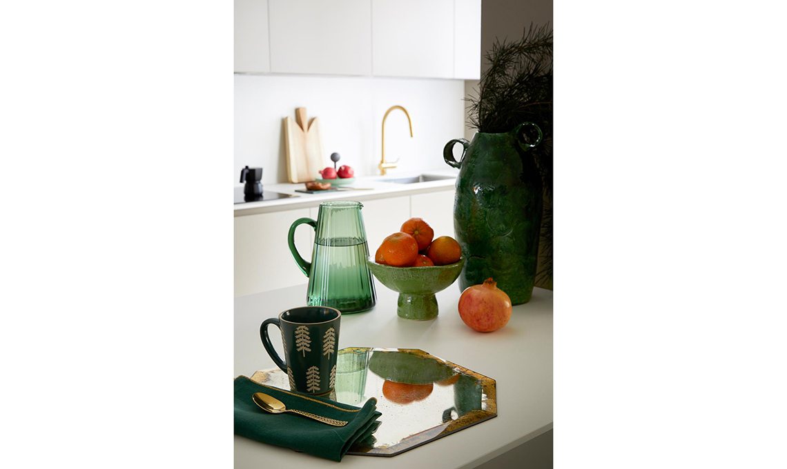 Sul top dell’isola: sottopiatto specchio Octo e tovagliolo Evelina [Borgo delle Tovaglie], caraffa verde e mug [Croff], bollitore Plissè, alzata Mattina, teiera e zuccheriera Cha e caffettiera Moka di [Alessi], posate Cortina [Sambonet], taglieri in marmo coll. Paola Speranza [Espi Design] e in noce bruciato [Society Limonta] come il candeliere; alzata e vaso in ceramica [Heart_Ista].