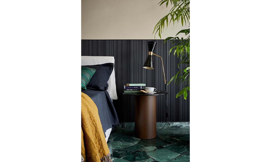 Dietro il letto Nathalie [Flou] vestito con lenzuola Mykonos in lino nero, plaid Bogotà in misto alpaca antracite e Dioniso oro in lana merinos, tutto di [Lanerossi], più cuscini Soft [Scappini Home], Tappezzeria Tonga colore 1082.19 [Vescom]. Parete e soffitto dipinti con idropittura codice colore F3.08.75 [Sikkens], scultura Cubo Schiacciato [Antonino Sciortino]. Sospensione