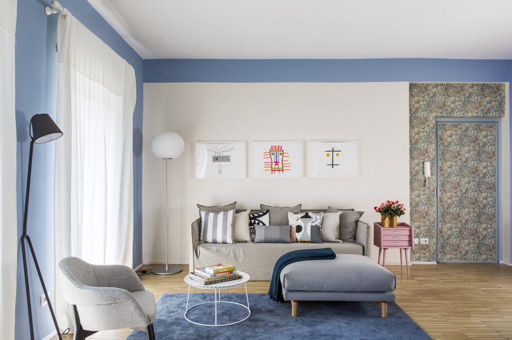 La casa è molto luminosa e ha permesso di osare con fantasie importanti e colori forti sui muri, in contrasto con l’essenzialità degli arredi di design. Nel living, per esempio, oltre a posare nella zona lettura e sulla porta d’ingresso una tappezzeria all’inglese, le pareti sono state anche dipinte con maxi-fasce blu avio, colore usato anche in cucina, in modo da creare delle cornici che sembrano inquadrare i mobili.