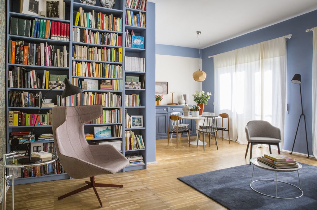 Poltrona Take a Line for the Walk [Moroso, a Roma da Magazzini Associati, cm 80x88x110h €2.600], tavolino Eileen Gray di [B&B], lampada Mantis [a Roma da Mia Home Design Gallery €510]. La libreria è ridipinta con lo smalto Intelligent Eggshell James [Little Greene, da Il ladro di Fragole €46/latta da 1 litro].