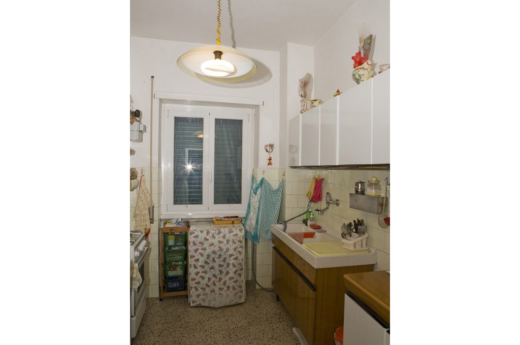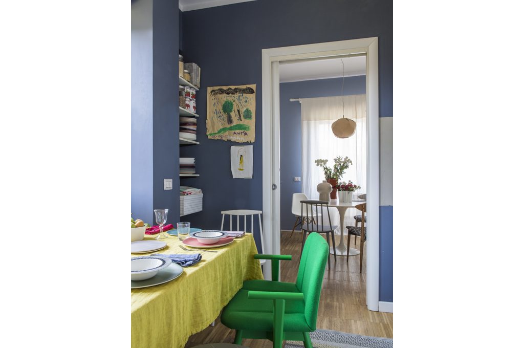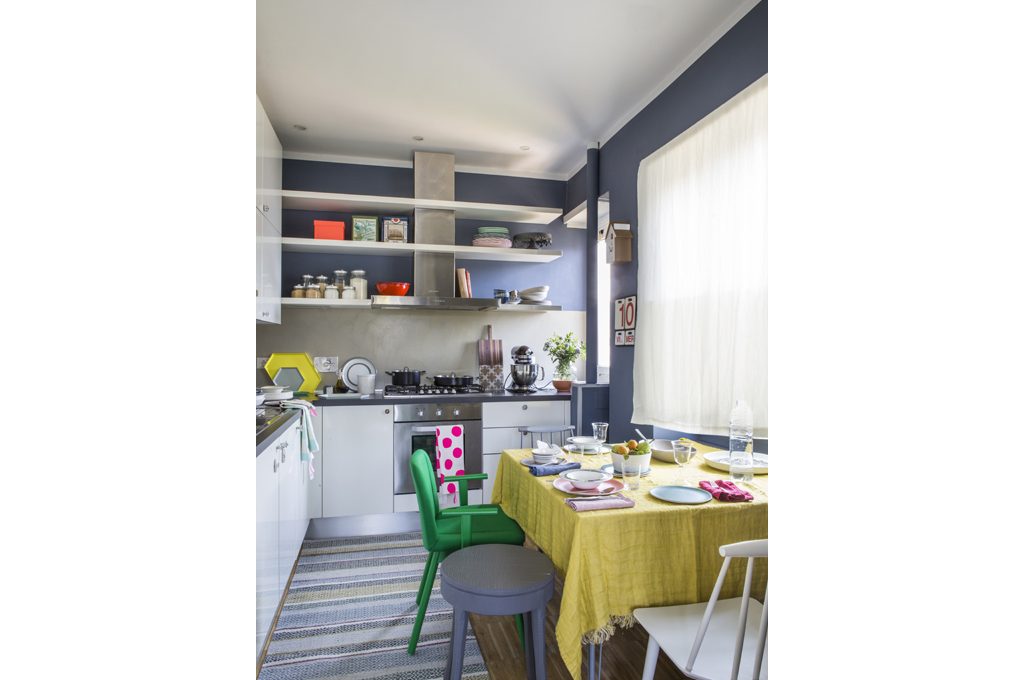 Cucina [Lube]; piatti [€16 cad] e tovaglia [da Magazzini Associati] più tovaglioli [La Fabbrica del Lino]. Sedie a capotavola J77 [Hay €176 cad] e verde con braccioli [Billiani €405], sgabello Raw [Muuto da Magazzini Associati €200]. Oggetti [Diamantini & Domeniconi, Bitossi Home, KitchenAid, Mia Home Design Gallery, Danese]; tappeto millerighe [Dispensabile].