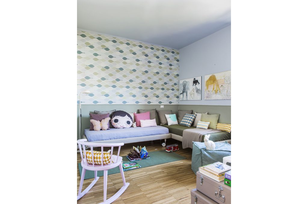 Letti a sommier [Moretti Compact] con lenzuola [Fazzini], più cuscini in tinta unita e grafici [da Le Civette sul Comò e Trend House]. Sul pouf Ghost 08 [Gervasoni, cm 90x90x40h da €302], lampada coniglietto [Le Civette sul Comò]; sulla sedia a dondolo W [Billiani €375], cuscino a rombi [Trend House]. Idropittura Absolute Matt Normandy Grey [Little Greene da Il Ladro di Fragole €124 per 5 lt], tappezzeria a pesciolini Fish Wish [Mr Perswall €48/mq]; tappeto [Kasthall] e quadri [Magis]